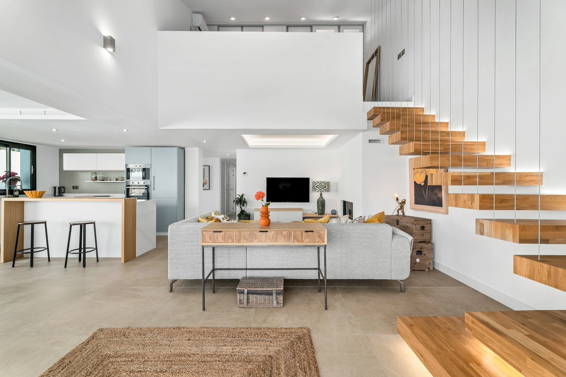 The open plan kitchen is connected to the living room with all quality appliances such as ceramic hob, fridge, microwave, freezer, washing machine, crockery/cutlery, kitchen utensils, coffee machine, toaster, kettle and juicer.